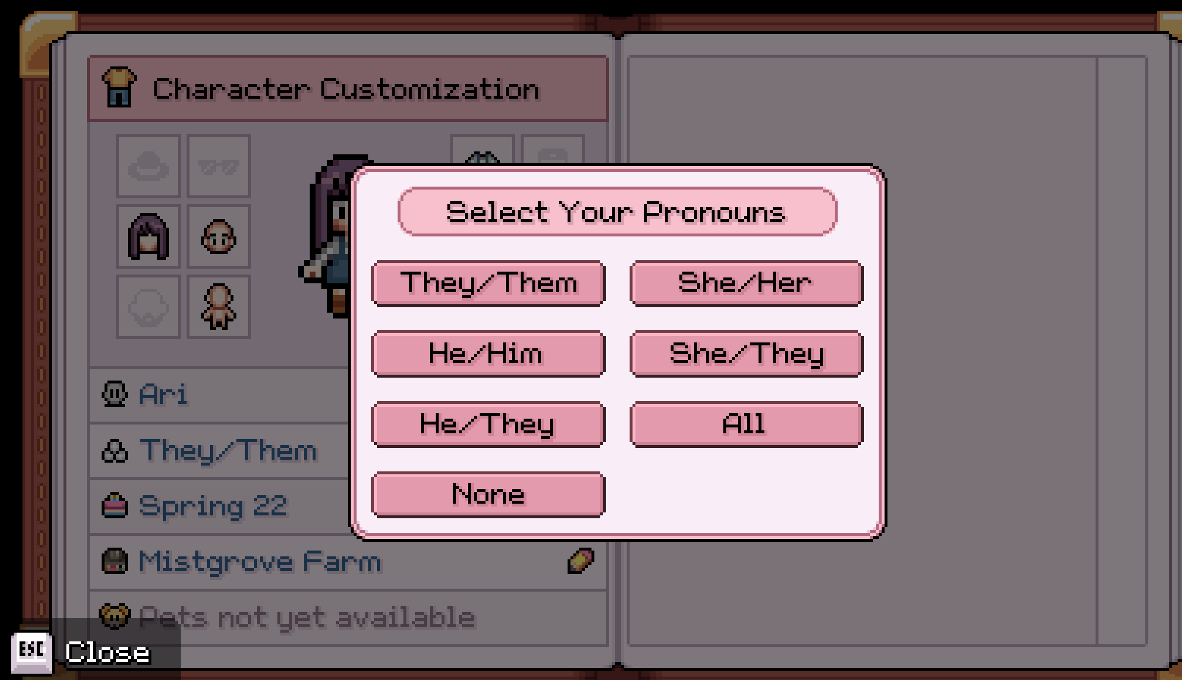 I played the Fields of Mistria demo. It's great. I love it. I am absolutely playing this when it releases. The only way this pronoun selection would be better is if you could customize it with neo-pronouns.